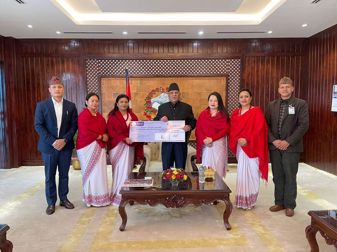 नेपाल प्रहरी श्रीमती संघद्वारा भुकम्प पिडितकाे सहयाेगार्थ प्रधानमन्त्रीलाई चेक हस्तान्तरण